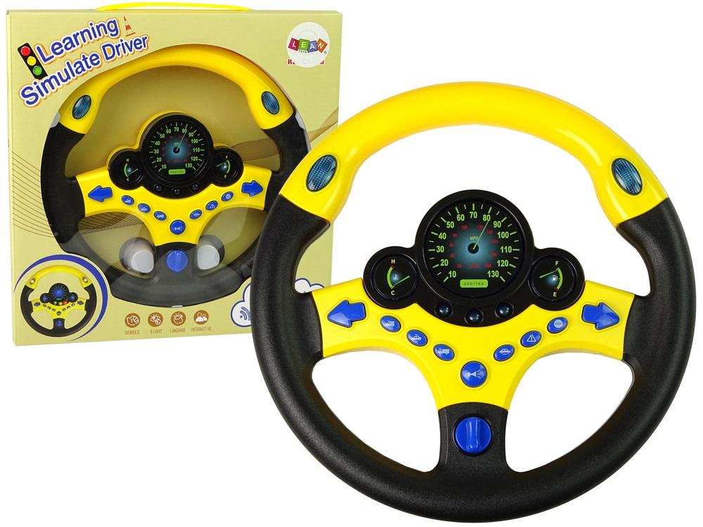 Kierownica jest w kolorystyce żółto- czarnej. Cała kierownica ma 9 przycisków w tym dwa kierunkowskazy, klakson oraz sygnały służb ratunkowych. Wystarczy, że przekręci kluczyk startu i może rozpocząć zabawę ! Zegary na kierownicy podświetlają się na niebiesko. Wygląd oraz diody sprawią, że maluch poczuje się jak na prawdziwej ulicy, prowadząc swoje autko. Kierownica pasuje idealnie do rączki malucha. Czas na symulacje jazdy w wykonaniu Twojego dziecka.