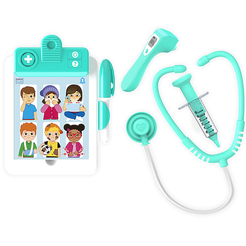 "SMILY TABLET CENTRUM MEDYCZNE 1/4 SP83816 Tablet jest interaktywną zabawką, która przypomina kartę pacjenta. Dziecko może poczuć się jak prawdziwy lekarz, jednocześnie bawiąc się i ucząc. Na tablecie przedstawione są postacie pacjentów, którzy cierpią na różne dolegliwości. Tablet wydaje dźwięki. Do tabletu dołączony jest specjalny długopis, dzięki któremu dziecko może zaznaczać na karcie pacjenta właściwe pola. Do tabletu dołączone są atrybuty prawdziwego lekarza. Należą do nich: • stetoskop, • termometr, • strzykawka. Urządzenie posiada przycisk funkcyjny odpowiedzialny na włączenie i wyłączenie urządzenia. Zabawka przeznaczona jest dla dzieci w wieku od dwóch lat. SPECYFIKACJA: • SP83816 • EAN 5905375838164 • wym. 40 x 25 x 0,5 cm • baterie 2 x AAA (w zestawie) • wiek 2+ • importer Anek dla dzieci "