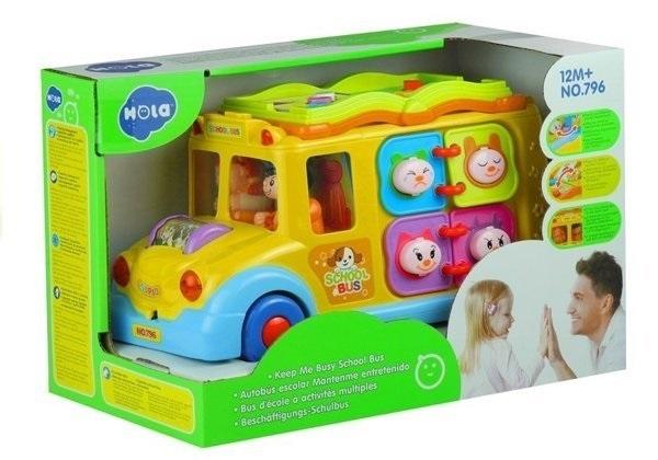 Z przodu autobusu znajduje się kolorowy obrotowy wałek ze zwierzątkami, który po przekręceniu powoduje uruchomienie odgłosu śmiejącego się dziecka i przyjemnej dla ucha melodyjki. Na dachu zabawki znajduje się kolorowa książeczka z przyciskami o różnych kolorach i kształtach.