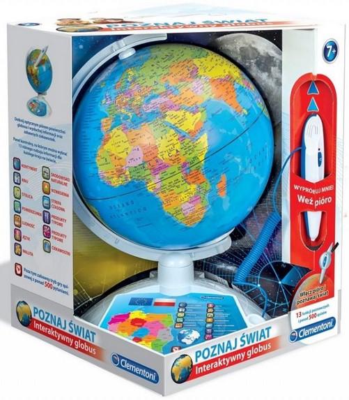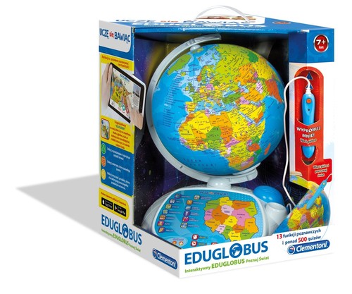 Interaktywny mówiący globus z czujnikiem optycznym w kształcie pióra. Dużo informacji na temat: kontynentów, krajów, stolic, powierzchni, populacji, walut, języków, terytoriów, czasu, ciekawostek, lokalnych produktów. 500 pytań do przetestowania nabytej wiedzy. Darmowa aplikacja na smartfon lub tablet dla jeszcze większej zabawy.
