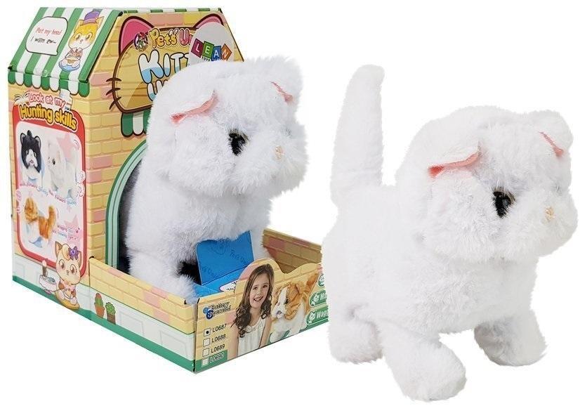 Biały puchowy kotek z dużymi oczami dodaje uroku i nie można oderwać od niego wzroku. Kotek spaceruje, lub porusza się zwiększając tempo na szybsze. Dodatkowo otwiera pyszczek, porusza ogonkiem i wydaje dźwięki po pogłaskaniu po głowie. Wyjątkowy przyjaciel dla Twojego dziecka. Zabawa sprawi mu nie lada frajdę, a może i stworzy mały kącik kotku we własnym pokoju.