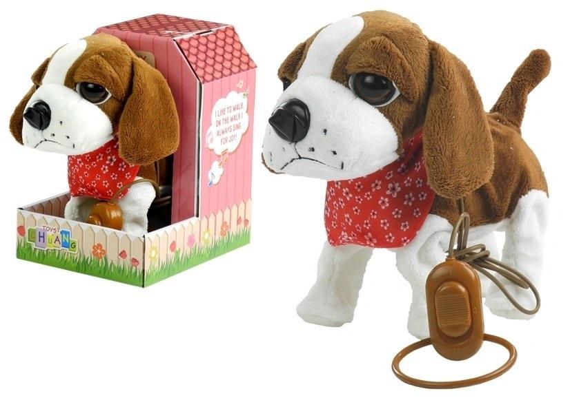 Interaktywny Piesek Biało-Brązowy Na Smyczy Buda Jeśli Twoje dziecko od zawsze marzy o własnym zwierzaku -- opiece nad nim, wychodzeniu na długie spacery, a przede wszystkim wspólnej zabawie, na smyczy będzie doskonałym pomysłem. Zabawka ta pomoże Twojemu dziecku nabyć umiejętności niezbędne do posiadania własnego zwierzątka. Zabawa z pluszowym pisakiem nauczy go i w opiece, co będzie bardzo ważne w przyszłości. Brązowo-biały pies na smyczy wykonany jest z miękkiego i nietoksycznego, w 100% przyjaznego dla środowiska materiału, który jest bardzo przyjemny w dotyku. Zwierzak ma duże, ciemne oczy, wystający ogonek i duży nos, który delikatnie błyszczy. Ozdobiony jest czerwoną chusteczką, dodającą mu uroku. Zabawka posiada długą smycz zakończoną przełącznikiem, dzięki czemu dziecko w prosty sposób może sterować swoim pieskiem. Możliwość ta sprawia, że zabawa będzie wydawać się dziecku bardzo rzeczywista, a przede wszystkim ciekawa. Zabawkowy piesek przeznaczony jest dla wszystkich dzieci, które ukończyły 3. rok życia. Piesek posiada certyfikat CE, co jest potwierdzeniem, że spełnia wymagania dyrektyw Unii Europejskiej. Jest to bardzo bezpieczna zabawka, pozbawiona ostrych elementów. Wymiary zabawki: - piesek: 22 cm x 24 cm x 11 cm, - smycz: 97 cm. Wymiary opakowania: - 24 cm x 19 cm x 15 cm.