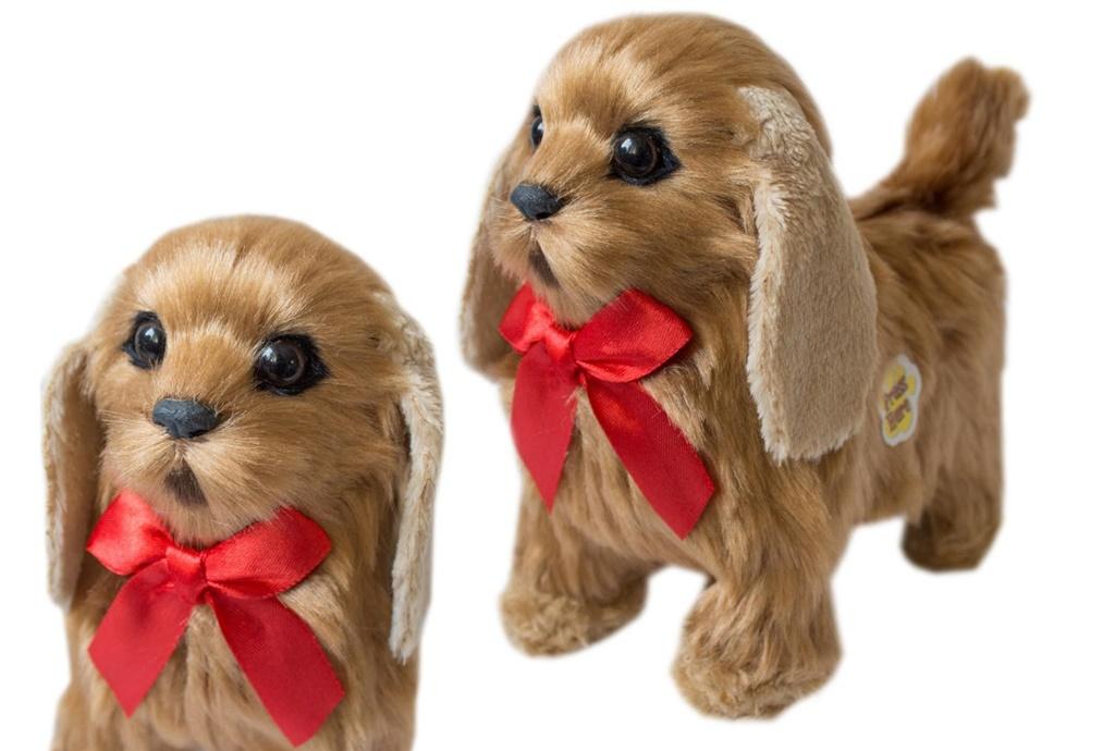 Interaktywny piesek szczeka, rusza głową i ogonem, chodzi, posiada muzykę. Wymiar psa 20 cm, zasilanie 3xAA (dołączone)