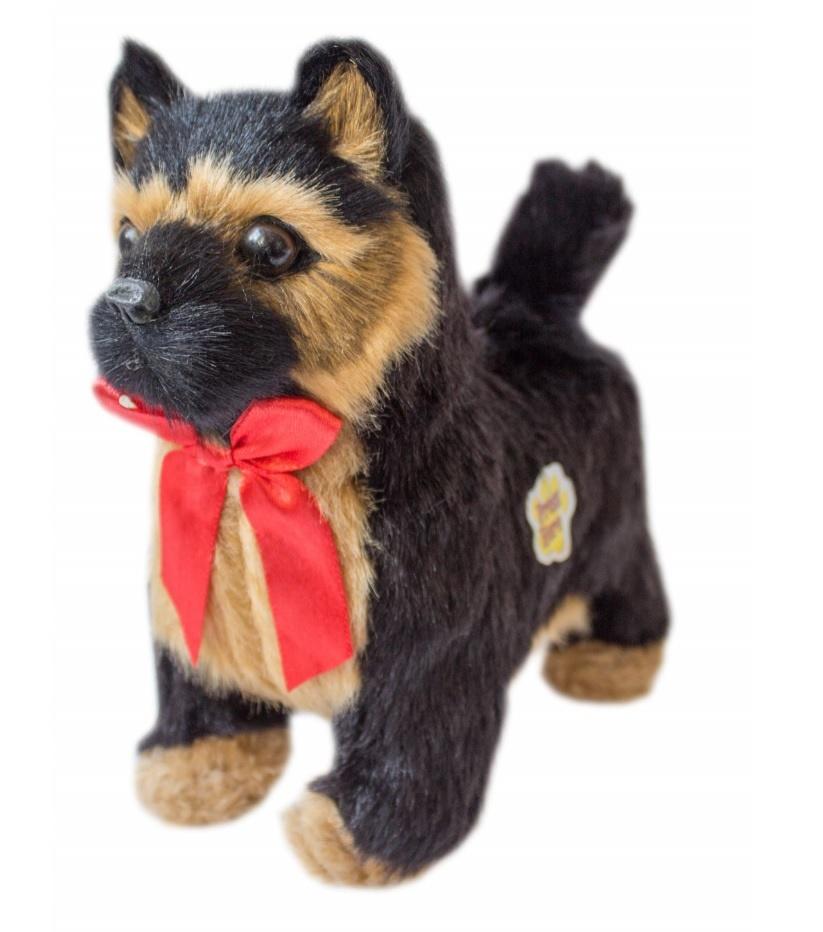 Interaktywny piesek szczeka, rusza głową i ogonem, chodzi, posiada muzykę. Wymiar psa 20 cm, zasilanie 3xAA (dołączone)