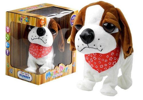 Interaktywny Piesek Szczeka Rusza Ogonkiem Sensory Jeśli Twoje dziecko od zawsze marzy o własnym zwierzaku - opiece nad nim, wychodzeniu na długie spacery, a przede wszystkim wspólnej zabawie, interaktywny piesek będzie doskonałym pomysłem. Zabawka ta pomoże Twojemu dziecku nabyć umiejętności niezbędne do posiadania własnego zwierzątka. Zabawa z pluszowym pisakiem nauczy go odpowiedzialności i sumienności w opiece, co będzie bardzo ważne w przyszłości. Zabawka posiada wiele zalet - piesek wesoło tańczy i śpiewa, co z pewnością będzie rewelacyjną frajdą dla każdego malucha. Brązowo-beżowy pies na smyczy wykonany jest z miękkiego i nietoksycznego, w 100% przyjaznego dla środowiska materiału, który jest bardzo przyjemny w dotyku. Zwierzak ma duże, ciemne oczy, wystający ogonek i duży nos, który delikatnie błyszczy. Ozdobiony jest czerwoną chusteczką, dodającą mu uroku. Zabawkowy piesek zapakowany jest w kolorowe pudełko z przezroczystą witrynką. Przeznaczony jest dla wszystkich dzieci, które ukończyły 3. rok życia. Piesek posiada certyfikat CE, co jest potwierdzeniem, że spełnia wymagania dyrektyw Unii Europejskiej. Jest to bardzo bezpieczna zabawka, pozbawiona ostrych elementów. Do zabawy z pieskiem potrzebujecie 4 sztuk baterii "AA". Wymiary zabawki: 22 cm x 24 cm x 11 cm Wymiary opakowania: 22 cm x 24 cm x 17 cm