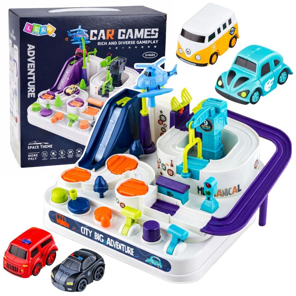 Zestaw nie wymaga zasilania bateryjnego, ponieważ wszystkie mechanizmy działają w oparciu o ruch ręczny oraz system grawitacyjny. Dzięki temu dziecko rozwija koordynację ręka oko, koncentrację oraz logiczne myślenie podczas pokonywania kolejnych wyzwań. W zestawie znajdują się 4 samochodziki oraz helikopter, co pozwala na różnorodną i długą zabawę.