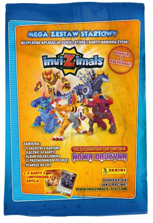 Invizimals „Nowa Drużyna“ to kontynuacja popularnej serii składająca się z 420 kart do kolekcjonowania i grania. Korzystając z bezpłatnej aplikacji na smartfony, po zeskanowaniu specjalnego kodu znajdującego się na odwrocie karty, Invizimal przenosi się do rozszerzonej rzeczywistości, gdzie toczą się pojedynki. Grać można wirtualnie lub na specjalnej planszy. Zawartość zestawu startowego: 4 saszetki z kartami (łącznie 24 karty) album kolekcjonera (z przewodnikiem po grze) plansza do gry + 2 karty z limitowanej edycji. Wiek 6+