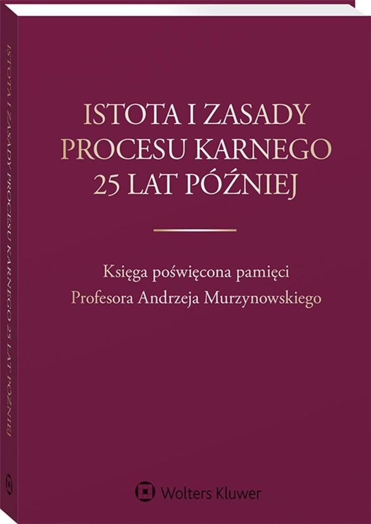 Księga pt. Istota i zasady procesu karnego 25 lat później. Księga poświęcona pamięci Profesora Andrzeja Murzynowskiego jest pośmiertnym hołdem złożonym Panu Profesorowi przez Jego przyjaciół i uczniów w trzecią rocznicę śmierci, która przypada 13.12.2019 r. Tytuł ten jest charakterystyczny; nawiązuje bowiem do okresu, który upłynął od ukazania się ostatniego wydania najważniejszego dzieła Pana Profesora: Istota i zasady procesu karnego (Warszawa 1994). Zadziwiające jest to, że mimo upływu tylu lat jest ono nieustannie aktualne i ważne, a dla kolejnych pokoleń procesualistów karnych stanowi z wyboru wciąż obowiązkową lekturę. Zawarte w Księdze teksty nawiązują treścią do poglądów i koncepcji Pana Profesora Murzynowskiego, a jednocześnie prezentują współczesne spojrzenie na istotę postępowania karnego.
