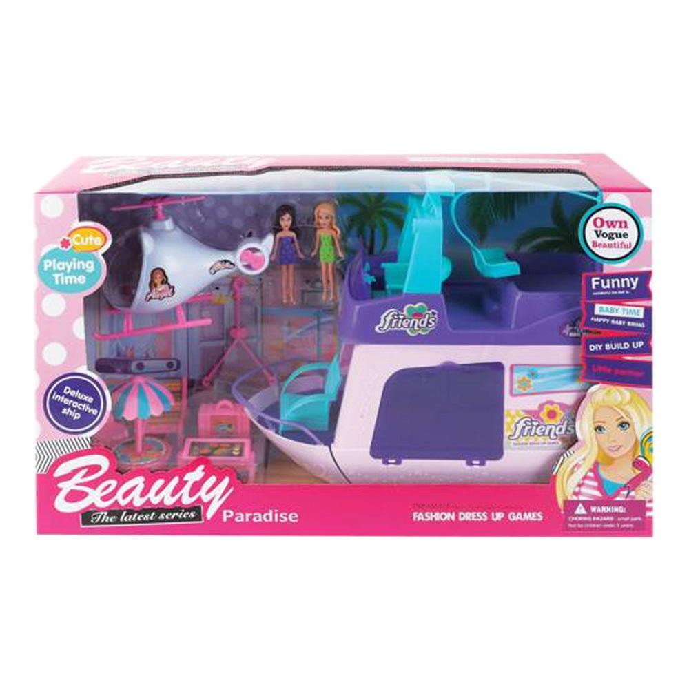 Jacht z dwiema lalkami, stolikiem z parasolem, dwoma krzesełkami, leżakiem, grillem i fotelem oraz helikopterem. Wymiary opakowania: 49 x 14 x 28.5 cm