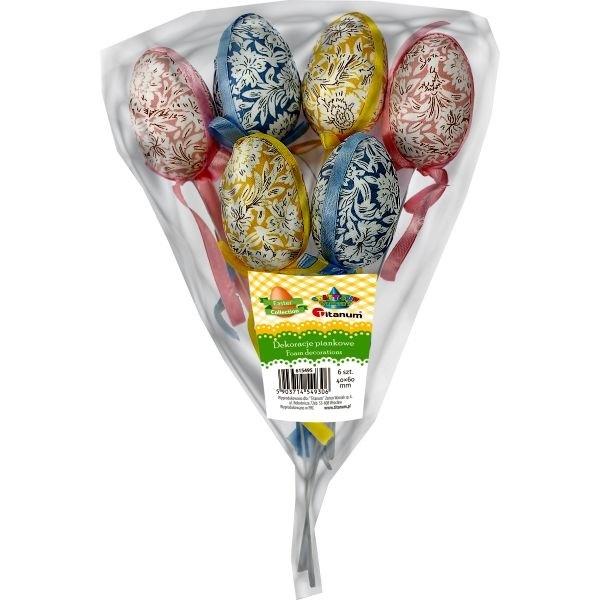Jajka styropianowe 38x58mm z dekoracją materiałową w kwiaty i wstążką na piku 3 kolory 6szt.