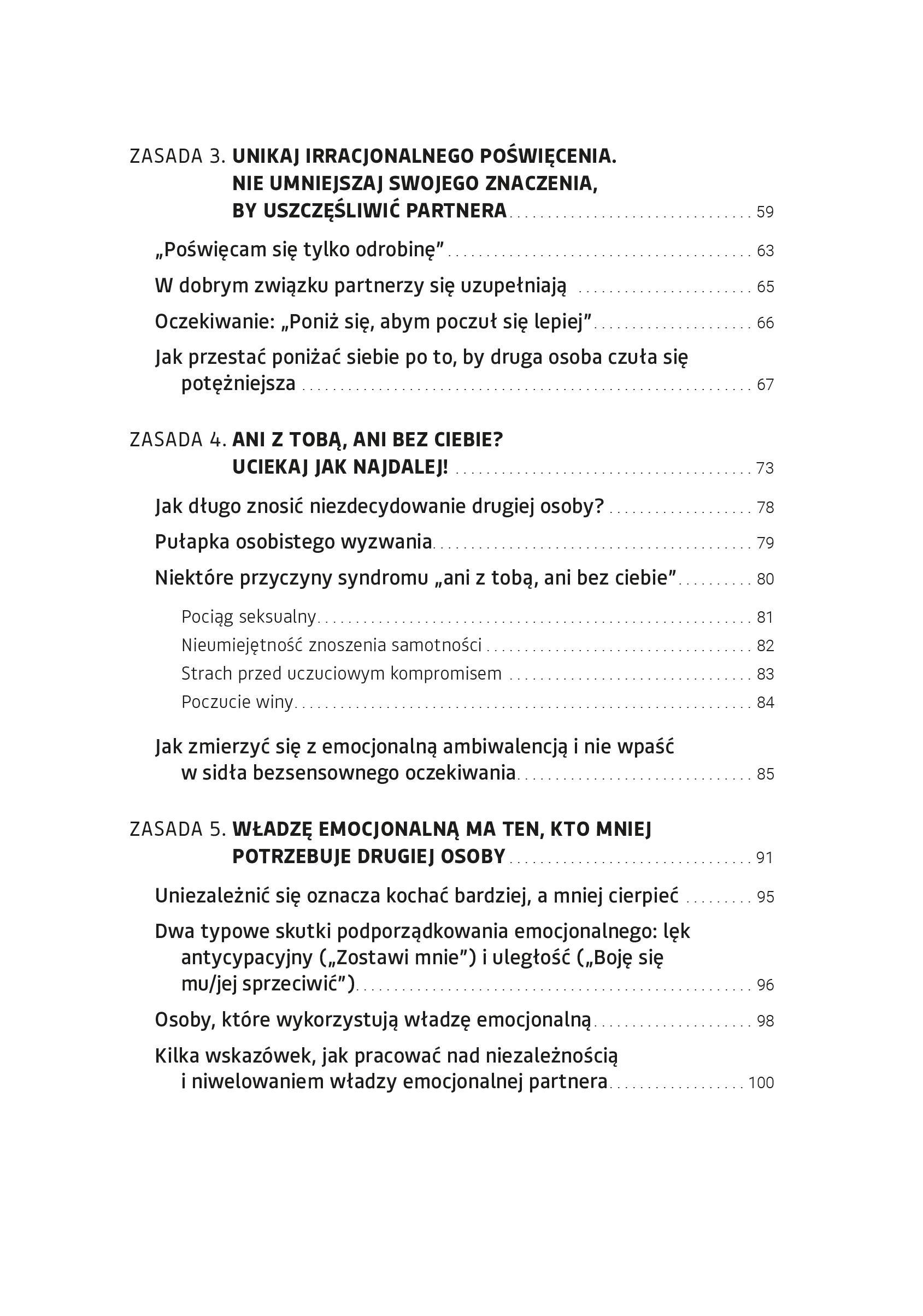 Dzięki tej książce dowiesz się, jak żyć miłością, ale się w niej nie zatracić. Nauczysz się, na czym polega zdrowa miłosna relacja, w której jest miejsce na wzajemny szacunek, rozwój i spełnienie. Wielu z nas traktuje miłość jak ciężar, który dźwigamy, ponieważ nie wiemy, że można kochać w zdrowszy sposób. Zdarza się, że rezygnujemy z własnych potrzeb, byle tylko nie sprawić bliskiej osobie przykrości czy kłopotu. Niektórzy pod wpływem uczuć nieświadomie krzywdzą siebie bądź partnera, inni z kolei nadmiernie idealizują osobę, z którą żyją, albo rezygnują z własnego rozwoju w imię miłości. Wszystko to sprawia, że zmieniamy się we własne cienie… Pamiętaj, że w zdrowym związku nie ma miejsca na męczeństwo, a jeśli musisz odsunąć własne potrzeby na dalszy plan lub niszczyć siebie, aby twój partner był szczęśliwy, twoje życie kręci się wokół niewłaściwej osoby albo to, jak postrzegasz miłość, doprowadziło cię we niewłaściwe miejsce. Wciąż jednak możesz to zmienić! Walter Riso, psycholog z 30-letnim doświadczeniem i autor 25 poradników psychologicznych, w tej książce opisuje rozmaite trudne sytuacje, z jakimi spotyka się w życiu każda osoba, która jest, była lub będzie w związku. Przedstawia też sformułowane przez siebie zasady funkcjonowania w miłosnej relacji, które dotyczą w zasadzie nas wszystkich. Jego rozsądne rady i wskazówki, ilustrowane historiami pacjentów, skłaniają do przemyśleń na temat własnych przeżyć i inspirują do początkowo małych, a z czasem wielkich zmian. Niezliczona liczba osób na świecie grzęźnie w gmatwaninie uczuć, oczekując odmiany swego losu i nie zdając sobie sprawy, że to one same muszą przeprowadzić własną rewolucję emocjonalną. Doświadcza tego każdy, kto na nowo sam wchodzi w związek zgodnie z własnymi potrzebami i podstawowymi przekonaniami, każdy, kto ją tworzy lub niszczy, korzysta z niej lub cierpi z jej powodu. Umieranie z miłości nie jest wam pisane ani zdeterminowane przez biologię, społeczeństwo czy siły pochodzące z kosmosu. Możesz ustanowić własne reguły i nie zgadzać się na bezsensowne cierpienie. Niech ta myśl wami kieruje. (fragment książki) Powyższy opis pochodzi od wydawcy.