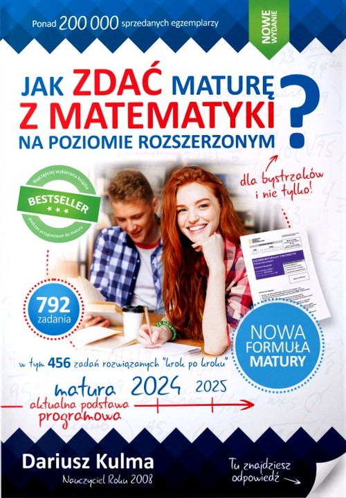 Liczba zadań: 792 Poziom: Rozszerzony Książka "Jak zdać maturę z matematyki na poziomie rozszerzonym? Dla bystrzaków i nie tylko" autorstwa Dariusza Kulmy to wyjątkowe kompendium wiedzy, które przeprowadzi Cię przez świat matematyki rozszerzonej na maturze. To niezastąpiony przewodnik, który oferuje innowacyjny system przygotowań, oparty na trzech filarach skuteczności. Matura z matematyki na poziomie rozszerzonym jest o wiele trudniejsza od tej z poziomu podstawowego. W odróżnieniu od matury na poziomie podstawowym nie ma tutaj tak wielu „pewniaków”. Jest jednak pewien kanon umiejętności, które, mimo zmian podstawy programowej, nadal będą pojawiały się w zadaniach maturalnych. Ta książka pomoże Ci opanować właśnie te najważniejsze umiejętności, byś mógł je skutecznie wykorzystać na maturze. Pierwszy filar - Przejrzysta koncepcja zadań: Na początku każdego działu znajdziesz najważniejsze informacje i wzory. Wielu z nich nie znajdziesz w tablicach matematycznych, a korzystając z nich jeszcze skuteczniej będziesz rozwiązywać zadania. Drugi filar - Rozwiązywanie zadań w parach: Książka wykorzystuje innowacyjny sposób prezentacji zadań, układając je w pary zadań tego samego typu.     1. Zadanie do analizy: Pierwsze zadanie z pary to pełna analiza krok po kroku, dzięki której zdobędziesz pełne zrozumienie procesu rozwiązywania danego typu zadań.     2. Zadanie sprawdzające: Drugie zadanie to sprawdzian Twojej samodzielności – jest to zadanie podobne do poprzedniego, które musisz rozwiązać samodzielnie. Taka struktura umożliwia efektywne zrozumienie procesu rozwiązywania zadań danego typu oraz zdobycie pewności siebie. Co więcej, przy zadaniu sprawdzającym znajdziesz pełne rozwiązanie, które pozwoli Ci zweryfikować poprawność Twojego rozwiązania.Takich zadań ułożonych parami jest w tej książce aż 456. Trzeci filar - System powtórek w odpowiednich odstępach czasowych: System powtórek to kluczowy element tego repetytorium, który opiera się na odkryciach specjalistów z dziedziny psychologii poznawczej, takich jak Hermann Ebbinghaus i Tony Buzan. Ebbinghaus wskazał na związek między zapominaniem materiału a liczbą powtórek, których powinno być 6-7, by zagadnienia zapamiętać trwale. Tony Buzan zauważył natomiast, że powtórki są efektywniejsze, gdy odbywają się w określonych momentach. To repetytorium wykorzystuje badania nad skutecznym zapamiętywaniem, dlatego pierwsza powtórka to zadanie sprawdzające, a kolejne pojawiają się, gdy rozwiązujesz zadania z podsumowań, umieszczonych na końcu każdego działu. Czym są podsumowania na końcu każdego działu? Podsumowania zawierają różnorodne zadania, również takie jak w nowej formule arkusza maturalnego. W sumie znajdziesz tu 336 zadania maturalne, które pomogą Ci coraz lepiej przygotować się do rozwiązywania egzaminacyjnych arkuszy. Co istotne, podsumowania te obejmują zagadnienia z poprzednich działów; na przykład w podsumowaniu nr 1 znajdziesz zadania z pierwszego działu, a w podsumowaniu nr 5 – zadania z poprzednich pięciu działów. Dzięki temu będziesz stale przypominać sobie zadania, które powtarzałeś wcześniej - i to aż do samej matury! Zaskoczysz się, jak dobrze i trwale będziesz pamiętać materiał. Dodatkowo, przy poszczególnych zadaniach w podsumowaniach znajdziesz wskazówki, najczęściej w postaci numeru podobnego zadania, a czasem informacji, gdzie szukać wskazówki. Na końcu książki znajdziesz odpowiedzi do wszystkich zadań, a nawet rozwiązania krok po kroku, gdy zadanie jest dowodem lub innym typem zadania wymagającym wykazania się. W przeciwieństwie do innych podręczników, w których dowody bywają bez odpowiedzi czy rozwiązania, ta książka stawia na pełne wyjaśnienie. Jeśli poważnie myślisz o maturze na poziomie rozszerzonym, to ta książka jest fundamentem Twojej wiedzy i Twoich przygotowań.