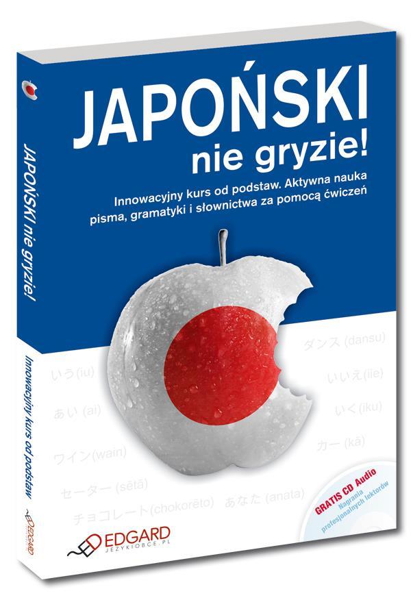 JAPOŃSKI nie gryzie! to kurs, z którym: - aktywnie uczysz się języka od podstaw, - poznajesz japońskie pismo, - uczysz się pierwszych znaków kanji, - praktycznie trenujesz znajomość gramatyki, - przyjemnie poznajesz użyteczne słownictwo. Kurs przeznaczony jest zarówno dla uczniów, jak i dorosłych samouków dopiero zaczynających naukę, którzy chcą łatwo i przyjemnie opanować podstawy języka japońskiego. Książka (184 str.) opiera się na niezwykle atrakcyjnej metodzie aktywnej nauki języka poprzez rozwiązywanie różnorodnych ćwiczeń. W rozdziałach tematycznych znajdziesz: 70 najpopularniejszych zagadnień, materiały dla początkujących do nauki pisma – hiragany i katakany, krótkie dialogi lub teksty z polskim tłumaczeniem, gramatykę w pigułce, porcję niezbędnego słownictwa, ciekawostki o kulturze oraz specjalną sekcję Sprawdź się z zadaniami podsumowującymi. W każdej chwili masz dostęp do umieszczonych na marginesach praktycznych minisłowniczków, a dodatkowo na końcu książki znajdziesz podręczny zbiorczy słownik. GRATIS płyta CD Audio z nagraniami profesjonalnych lektorów pomaga w nauce poprawnej wymowy oraz ćwiczeniu rozumienia ze słuchu. Odkryj unikalną metodę aktywnej nauki. Przekonaj się, że japoński nie gryzie!