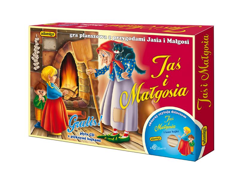 Uczestnicy gry wcielają się w głównych bohaterów popularnej bajki: Jasia i Małgosię oraz Babę Jagę. Dzieci zostały schwytane i uwięzione przez przebiegłą Babę Jagę. Postanowiły uciec podczas jej nieobecności. Baba Jaga wyszła do lasu po zioła i trujące grzyby do czarodziejskiego wywaru. W tym czasie Jaś i Małgosia uciekają z niewoli. Aby odnaleźć drogę powrotną muszą odnaleźć i zebrać kamienie, które Jaś wyrzucał, aby oznaczyć trasę. Muszą bardzo uważać, by nie schwytała ich Baba Jaga... Gra zawiera płytę audio CD z najpiękniejszymi bajkami. Na każdej płycie znajduje się 6 bajek. Zawartość: - plansza - 2 pionki z postaciami - kostka - 15 żetonów - instrukcja Liczba graczy: 2 Wiek graczy: 5+