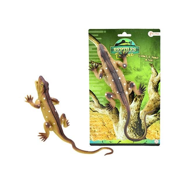 Jaszczurka w kolorze brązowym to niewiele odbiegająca kształtem i teksturą imitacja gada o egzotycznym ciemnym ubarwieniu w białe kropki. Ruchomy ogon i otwarty pysk nadaje jaszczurce naturalizmu podczas zabawy. Jaszczurka w pozycji wyczekującej w małych rozmiarach bardzo łatwo nada się do zakamuflowania nawet w ciężko dostępnych miejscach. Dostarczy przy tym wiele frajdy, a mała waga pozwoli na usadowienie jej na przykład na gałęzi drzewka. Może stanowić również ciekawą alternatywę do ozdób w akwarium i oczkach wodnych.