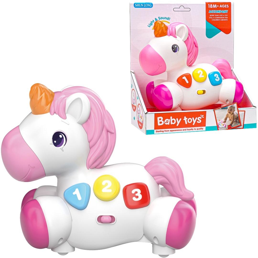 Funkcje Światło i Dźwięk: Jednorożec wyposażony jest w efekty dźwiękowe i świetlne, które stymulują zmysły dziecka, rozwijają ciekawość i zachęcają do interakcji.