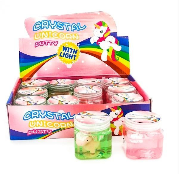 Masa żelowa, w której zatopiona jest malutka figurka jednorożca (zabawka po wstrząśnięciu świeci).
