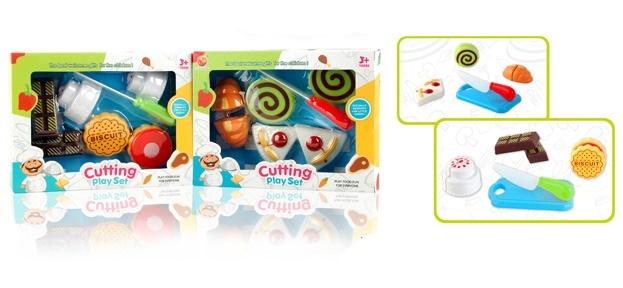Zestaw dla dzieci z ciastkami i słodyczami do krojenia. W zestawie znajdują torty i inne słodkości, które można przekroić na pół. Do zestawu dołączoną deskę do krojenia oraz bezpieczny nożyk. Zestaw wykonany z wysokiej jakości materiałów z zachowaniem drobnych szczegółów. Zestaw składa się z 8 elementów w tym 3 można przekroić na pół. Elementy łączą się przy pomocy rzepów.