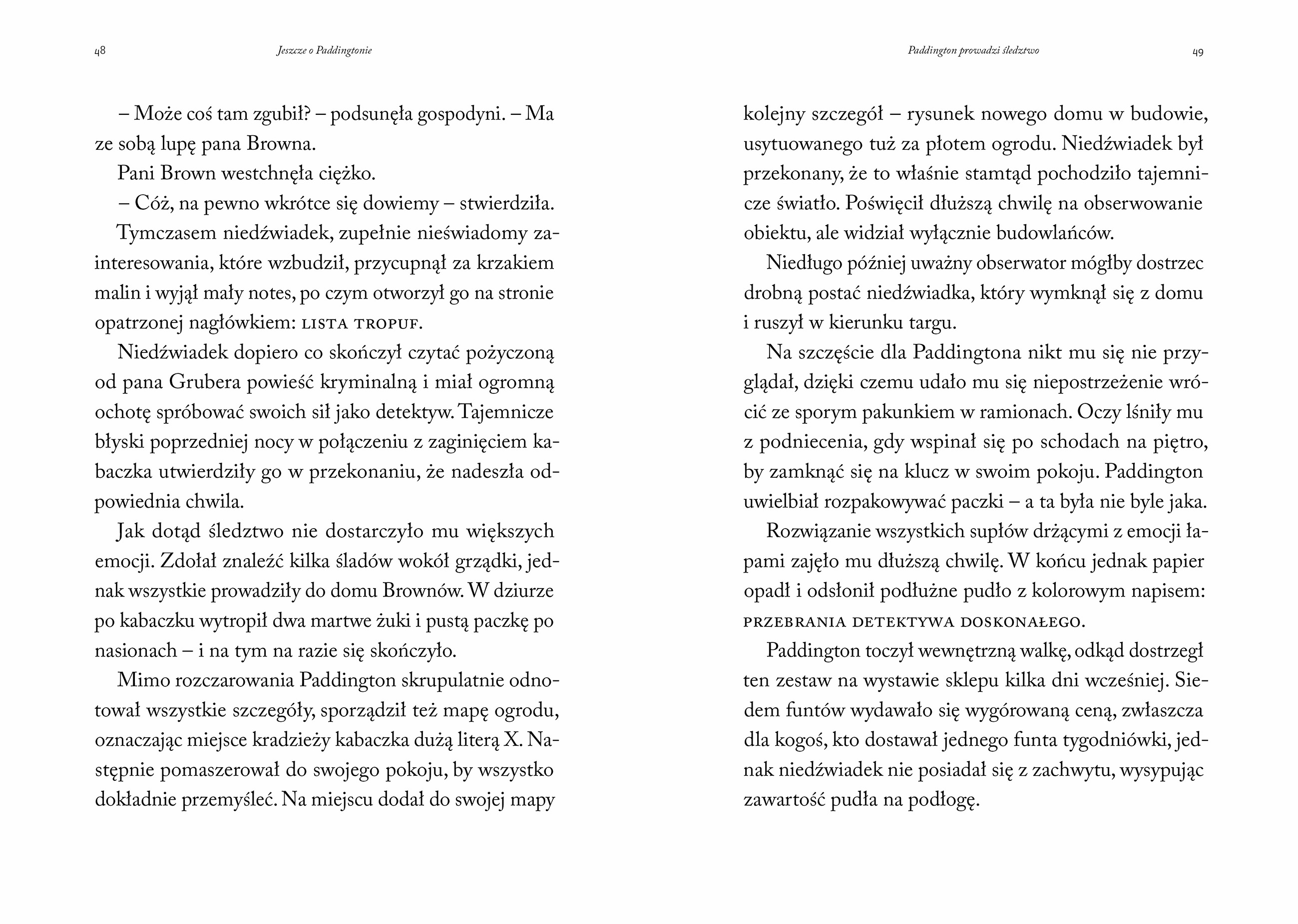 Paddington, elegancki niedźwiadek w kapeluszu, przybysz z dalekiego Peru, już wie, że kanapka z marmoladą najlepiej smakuje we własnym domu. Zwłaszcza gdy przygotuje ją pani Bird. Dla rodziny Brownów miś byłby w stanie zrobić wszystko! Więc gdy ginie ważna rzecz pana Henry'ego, Paddington rusza z pomocą. Czy w sercu niedźwiadka jest dość odwagi, by w ciemną noc przeprowadzić śledztwo w poszukiwaniu złodziejaszka?