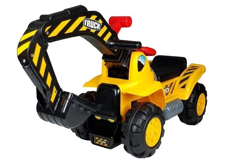 Jeździk Koparka z Ruchomym Ramieniem Jeździk został zaprojektowany z myślą wszystkich o energicznych kilkulatkach będących w kilku miejscach jednocześnie. Koparka porusza się w bardzo prosty sposób - wystarczy, że mały kierowca będzie naprzemiennie odpychać się nóżkami od podłoża. Dziecięcy jeździk koparka jest fantastycznym ułatwieniem dla wszystkich rodziców, ponieważ umożliwia weekendowe spacery i wycieczki bez konieczności zabierania ze sobą wózka. Jeździk wykonany jest z platikowej żółtej obudowy z czarnymi dodatkami kół, obrotowej kierownicy, opierania oraz ruchomego ramienia zakończonego łyzką. Siedzisko zabawkowego auta jest podnoszone - przestrzeń znajdującą się pod nim można wykorzystywać między innymi na przechowywanie ulubionej zabawki maluszka lub ubranka na zmianę. Wykorzystanie w codziennej zabawie prezentowanego pojazdu dla kilkulatka w ogromnym stopniu wpływa na jego rozwój. Jeździk wspiera koordynację wielu części ciałka dziecka jednocześnie, rozwijając także mięśnie, a co równie istotne - wspomagając naukę samodzielnego, stabilnego chodzenia. Jazda białym samochodzikiem do odpychania pozwoli dziecku zrozumieć, czym jest prędkość, odległość czy kierunek. Koparka Zasilana Bateriami 3x15V ""AA"", których nie dołączono do zestawu. Po umieszczeniu ich w koparce będziemy mogli usłyszeć jakie dźwięki kryje panel muzyczny, na którym osadzona jest kierownica. Przycisk z kluczem to dźwięk odpalania naszej koparki. Po przeciwnej stronie znajduje się klakson. Poniżej są dwa przyciski z charakterystycznymi dla pojazdów budowlanych odgłosami oraz regulatory głośności. Dziecięcy minipojazd został zaprojektowany z dbałością o najmniejszy szczegół, co w znacznym stopniu oddziałuje na pozytywne odczucia młodego kierowcy. Solidna, acz lekka i prosta konstrukcja gwarantuje przednią zabawę przez długie lata.Kształt jeździka koparki oraz produkcja z użyciem materiałów najwyższej jakości podnosi jego odporność na uszkodzenia mogące postać podczas szalonej zabawy. Wymiary jeździka: -Cała koparka z Ramieniem : 83cm x 47cm -Siedzisko : 23cm x 15cm -Odległość od siedziska do ziemi: 24cm Wymiary opakowania: 60 cm x 32,5 cm x 37 cm.