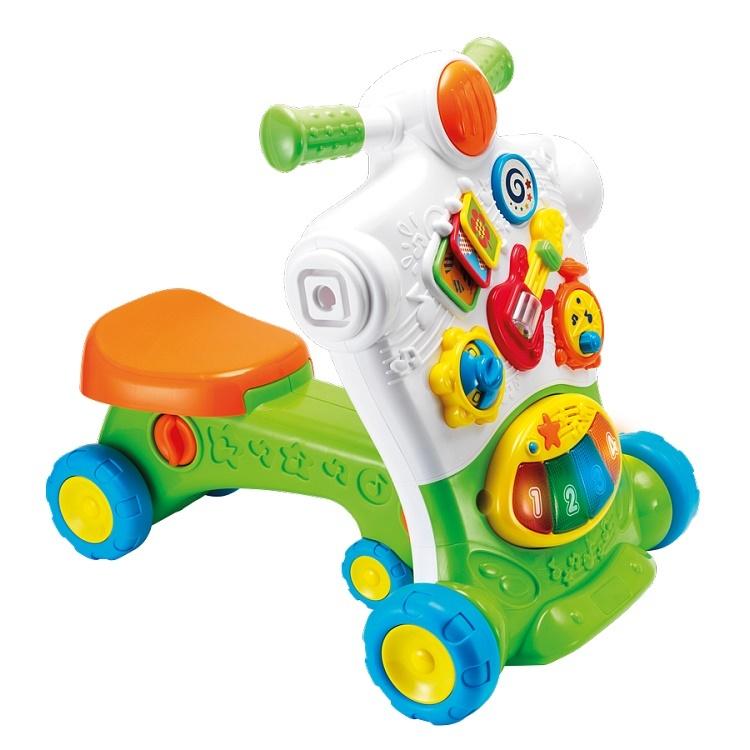 Multifunkcyjny jeździk 3w1, który zadba o to, aby Twój Maluch się nie nudził! Dziecko może z niego korzystać na 3 różne sposoby: w formie jeździka siedząc na siodełku i odpychając się nóżkami, pchacza idąc za nim i popychając go przed sobą, a także bawiąc się panelem znajdującym się z przodu jeździka i odkrywając umieszczone na nim niespodzianki. A wśród nich: ruchome i terkoczące elementy, obracające się spirale oraz wyjmowane pianinko ze świecącymi guziczkami, na którym bobas może zagrać własną kompozycję! Budowa jeździka pozwala na jego szybkie i bezproblemowe przekształcenie do wybranej pozycji.