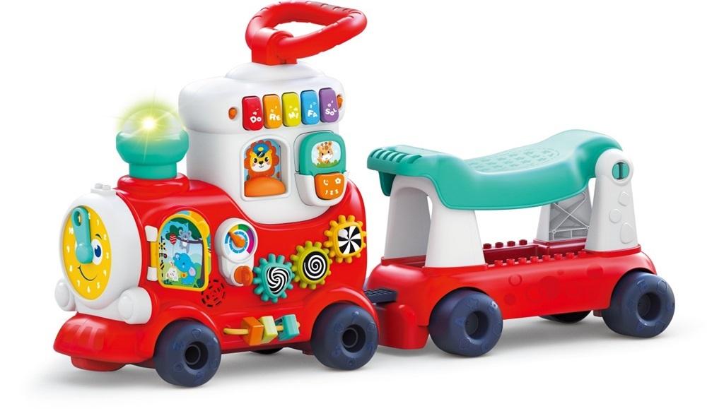 Kolorowy pociąg zabierze malucha na przejażdżkę z atrakcjami! Wyposażony jest w aż 4 różne tryby: siedzenie na wagoniku i odpychanie się nóżkami, odczepienie wagonika i chodzenie za ciuchcią, ciągnięcie wagonika, siedzenie przy ciuchci i zabawa aktywnymi elementami. Na małych odkrywców czeka tu wiele zadań, z pomocą których ćwiczyć mogą sprawność paluszków: tarcza zegara z ruchomą wskazówką, koraliki do przesuwania, książeczka ze stronami do przewracania, kolorowe trybiki do kręcenia i pianinko do tworzenia własnej melodii! Jeździk wyposażony został w światełko, wesołe dźwięki oraz melodie, a także regulację głośności, co pozwala dostosować go do potrzeb malucha