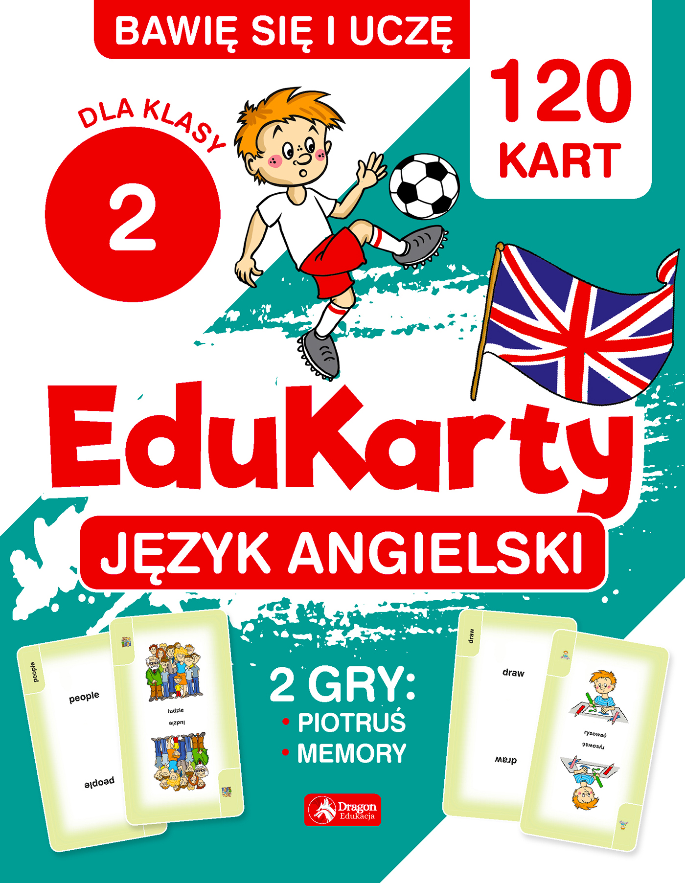 EduKarty. Język angielski to pomoc w nauce słownictwa języka angielskiego dla dzieci w klasach od zerówki do trzeciej. Zestaw przeznaczony jest do nauki w domu, w szkole i podczas kursów językowych. Zakres słownictwa obejmuje takie tematy jak części ciała, zabawki, szkoła, liczby, kolory czy pogoda. Zestaw zawiera: