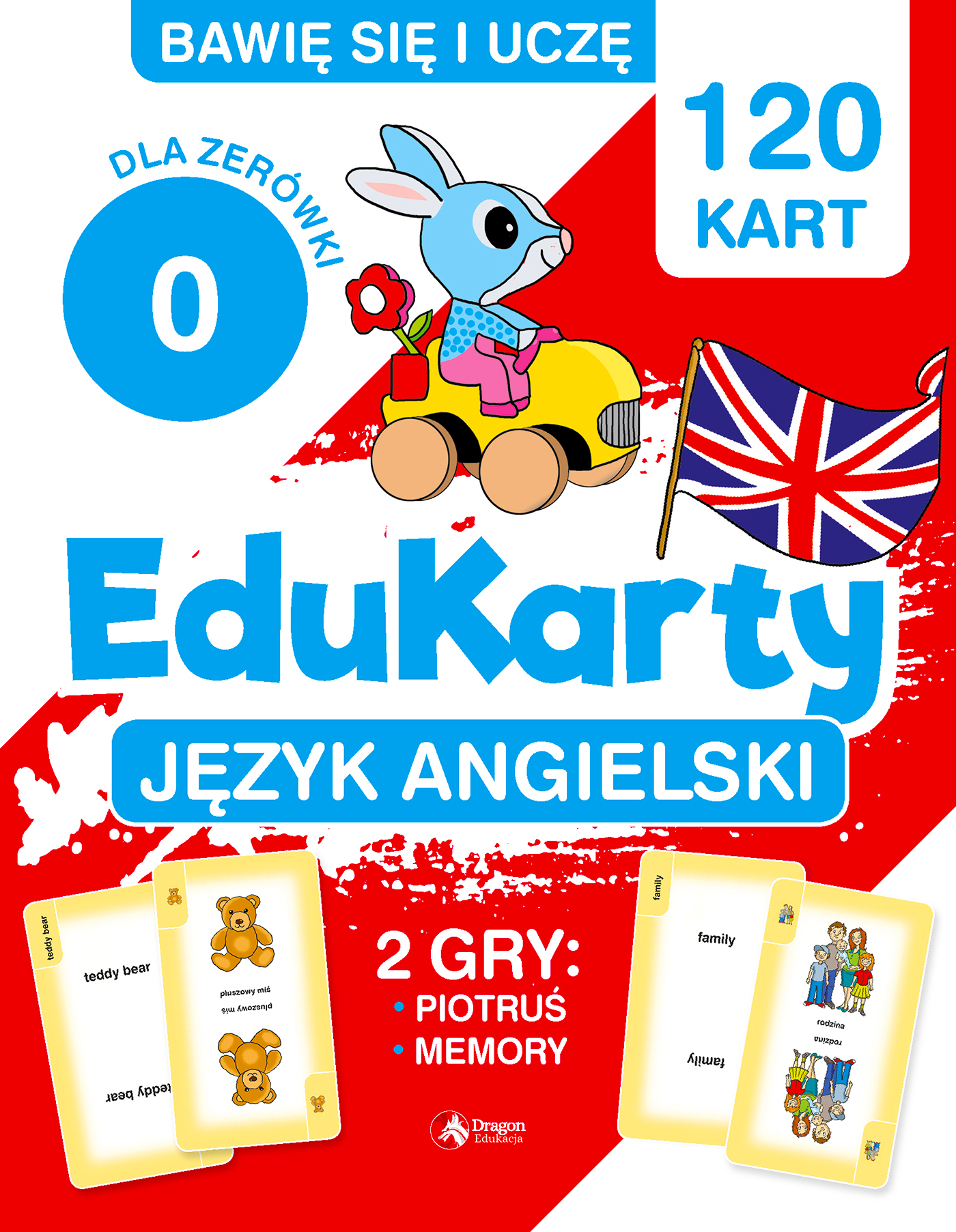 EduKarty. Język angielski to pomoc w nauce słownictwa języka angielskiego dla dzieci w klasach od zerówki do trzeciej. Zestaw przeznaczony jest do nauki w domu, w szkole i podczas kursów językowych. Zakres słownictwa obejmuje takie tematy jak części ciała, zabawki, szkoła, liczby, kolory czy pogoda. Zestaw zawiera: