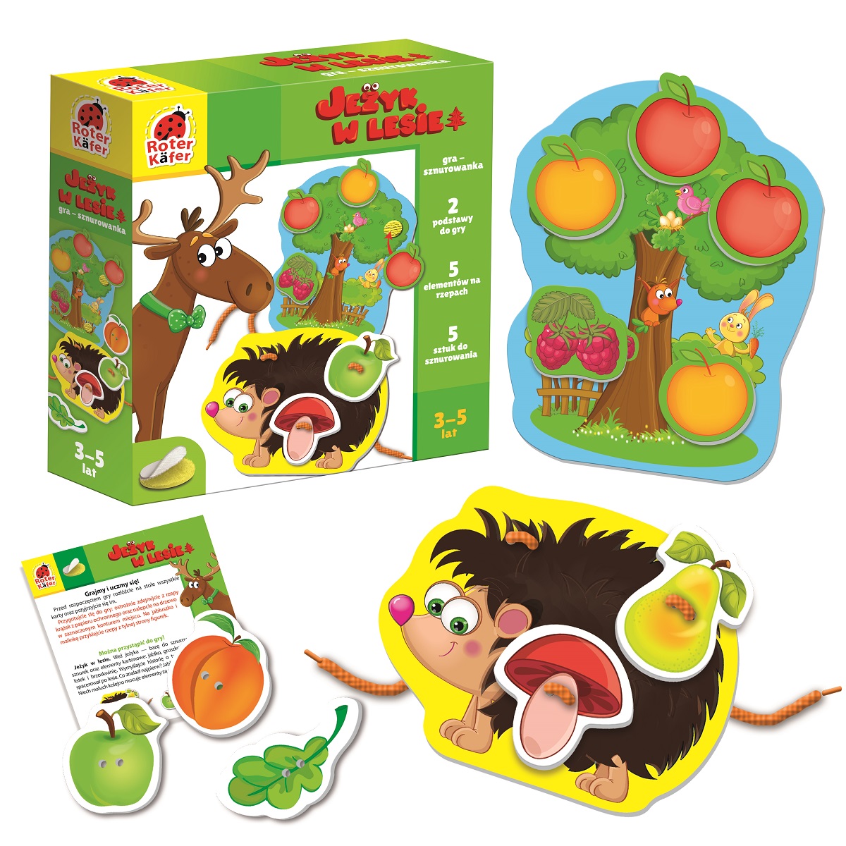 Uczymy się poruszania się i liczymy do 5 razem z zabawnym jeżem! Do karty podstawowej dołącz kartonowe figurki z jabłkami, grzybami i innymi leśnymi przysmakami. Ile jabłek pojawiło się na drzewie? Policz. Pozostałe owoce sznurujemy do podstawy jeża. Ma dziś dobre zbiory!