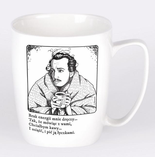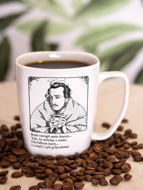 Brak energii mnie dręczy… Tak, że mówiąc z wami, Chciałbym kawy… I usiąść, i pić ją łyczkami. Kiedy w trudny poranek gryzie Cię robak smutku i zazdrościsz Salomei, że może śnić swój srebrny sen, Twoim wybawieniem może okazać się jedynie aromatyczna kawa. Wypita z kubka z fantazyjnym wizerunkiem Juliusza Słowackiego pobudzi do życia każdego Kołdriana! Juliusz nie pyta, Juliusz rozumie… Kubek JULIUSZ SŁOWACKI poleca się na prezent dla romantyka, polonisty, fana twórczości Słowackiego i każdego literata. Niech nigdy nie zabraknie im weny, energii i motywacji! Kubek z porcelany Pojemność: 380 ml Pojemność użytkowa: 360 ml Zapakowany w szykowny kartonik Idealny prezent na każdą okazję Nadruk po dwóch stronach kubka, logo na spodzie Można myć w zmywarce Wyprodukowano i zadrukowano w Polsce