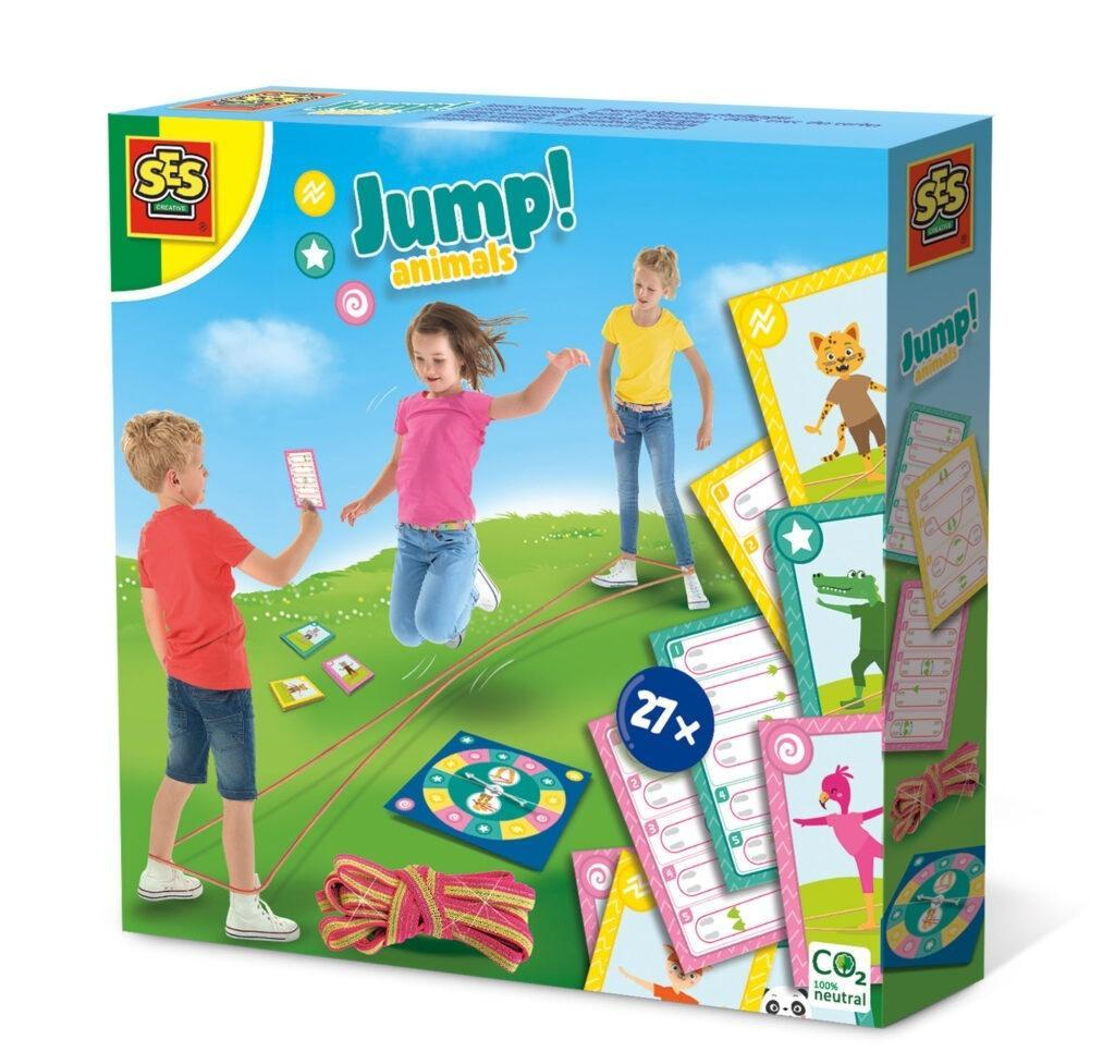 Gumka z zakrętem: oto Jump! Animals. Tablica spinner decyduje, jaki fajny trik musisz wykonać i jak trzymać błyszczącą elastyczną linę. 27 kart do gry z zabawnymi zwierzętami pokazuje, ile sztuczek potrafisz wykonać. Skacz, kręć i tup! Animals to najlepsza gra do gry ze znajomymi. Ile sztuczek potrafisz wykonać? Jeden, dwa, trzy, Jump!
