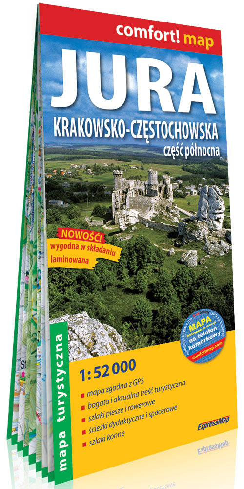 Jura Krakowsko-Częstochowska. Część północna Sanktuarium na Jasnej Górze w Częstochowie, słynne zamki w Mirowie i Bobolicach, przepiękny pałac Raczyńskich w Złotym Potoku to tylko niektóre atrakcje północnej części Jury Krakowsko-Częstochowskiej. Z naszą dwustronnie laminowaną mapą tego obszaru bez trudu można ich odnaleźć znacznie więcej. Publikacja została opracowana we współpracy z doświadczonym krajoznawcami z regionu. Mapa zawiera bogatą treść turystyczną, m.in.: • szlaki piesze i rowerowe, ścieżki dydaktyczne i spacerowe, trasy konne, • muzea, zabytki i inne interesujące obiekty, • parki narodowe i krajobrazowe, rezerwaty przyrody, atrakcje przyrodnicze. Cechy mapy: • ukształtowanie terenu przedstawione za pomocą poziomic i cieniowania, • dogodna zarówno dla pieszego, jak i rowerzysty, skala 1:52 000 (1 cm – 520 m), • zgodność z GPS – współrzędne geograficzne w układzie WGS-84, • trwałość – mapa jest dwustronnie laminowana, • wygoda składania.