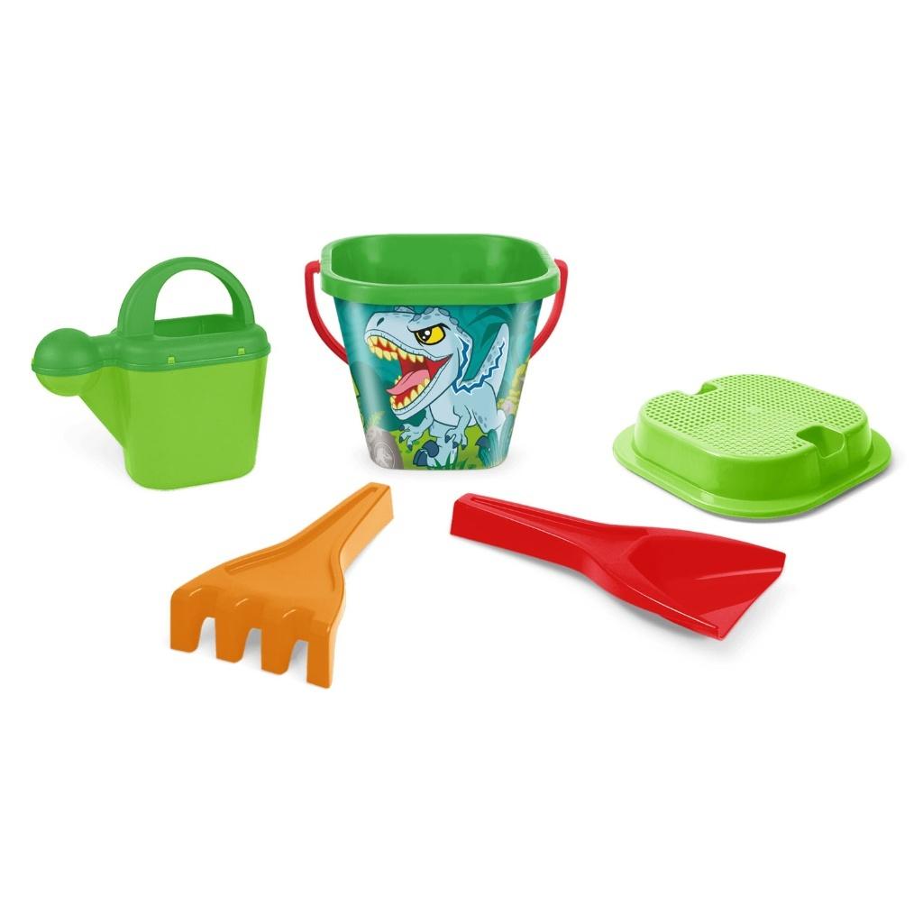 82341 JURASSIC WORLD EXPLORERS KOMPLET DO PIASKU 5 EL. Komplet do piasku z postaciami z bajki Jurassic World Explorers to świetny zestaw dla dzieci, idealny do zabawy nad morzem, jeziorem, w piaskownicy lub na balkonie. W jego skład wchodzą wiaderko, łopatka, grabki, sitko i konewka, które pozwalają tworzyć różnorodne piaskowe budowle. Zestaw zdobi grafika z postaciami z ulubionej przez dzieci bajki o dinozaurach Jurassic World Explorers, która rozwija wyobraźnię i kreatywność dzieci. Produkty marki Wader są odporne na deszcz, słońce i wilgoć, co sprawia, że zestaw można bezpiecznie zostawić w piaskownicy czy na balkonie. Trwały, kolorowy i praktyczny komplet gwarantuje godziny fantastycznej zabawy, wspierając rozwój manualny i wyobraźnię dziecka. To doskonały pomysł na prezent, który ucieszy każdego małego fana przygód Jurassic World Explorers! Komplet do piasku z grafiką z bajki Jurassic World Explorers to idealny zestaw dla dzieci, który sprawdzi się podczas zabawy nad morzem, jeziorem, w piaskownicy, czy nawet na balkonie. Zawiera wszystkie niezbędne akcesoria do kreatywnej zabawy w piasku i wodzie: wiaderko, łopatkę, grabki, sitko oraz konewkę, co pozwala na tworzenie różnorodnych piaskowych budowli i wzorów. Barwna i atrakcyjna grafika przedstawiająca postacie z uwielbianej przez dzieci bajki o dinozaurach Jurassic World Explorers została umieszczona na wiaderku. Grafika wykonana w technologii IML, jest trwale wtopiona w tworzywo, co oznacza, że jest wyjątkowo odporna na zniszczenie, zarysowanie czy odklejenie. Dzięki temu zestaw pozostaje piękny i atrakcyjny nawet po długim czasie intensywnego użytkowania. Zestawy letnie marki Wader wyróżniają się wysoką jakością wykonania. Są odporne na działanie warunków atmosferycznych, takich jak deszcz, słońce czy wilgoć. Można je bez obaw pozostawić w piaskownicy, ogrodzie czy na balkonie - elementy zestawu nie ulegną uszkodzeniu, a kolory pozostaną żywe i intensywne. Komplet letni z bohaterami bajki Jurassic World Explorers to nie tylko świetna zabawa, ale również sposób na rozwijanie zdolności manualnych, kreatywności i wyobraźni dziecka. Kolorowy, praktyczny i trwały zestaw sprawi radość każdemu małemu fanowi bajki, zapewniając godziny fantastycznej zabawy na świeżym powietrzu. To doskonały pomysł na prezent na każdą okazję! Komplet letni z wizerunkami postaci z bajki Jurassic World Explorers składa się z 5 elementów: wiaderka o pojemności 2 litrów, łopatki, grabek, sitka i konewki Zestaw dedykowany jest dzieciom 1+ Każdy z elementów charakteryzuje się dużą wytrzymałością i odpornością na warunki atmosferyczne Atrakcyjna grafika z wizerunkami ulubionych postaci oraz różnorodne kolory użyte w produkcji elementów, spodobają się dzieciom i uprzyjemnią zabawę