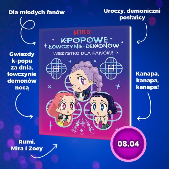 "K-popowe łowczynie demonów” („K-Pop Demon Hunters”) to światowy hit Netflixa, który podbił serca widzów i zdobył uznanie krytyków. Został nominowany do Oscara i nagrodzony Złotymi Globami w kategoriach najlepszy film animowany i najlepsza piosenka. Film łączy niesamowitą energię k-popu z epicką walką ze złem. Na scenie Rumi, Mira i Zoey są idolkami, a poza nią nieustraszonymi łowczyniami demonów.
