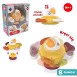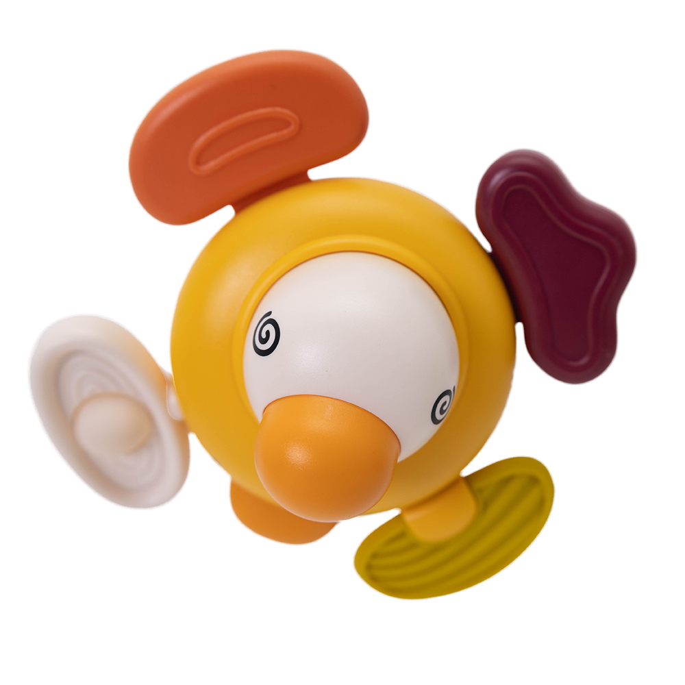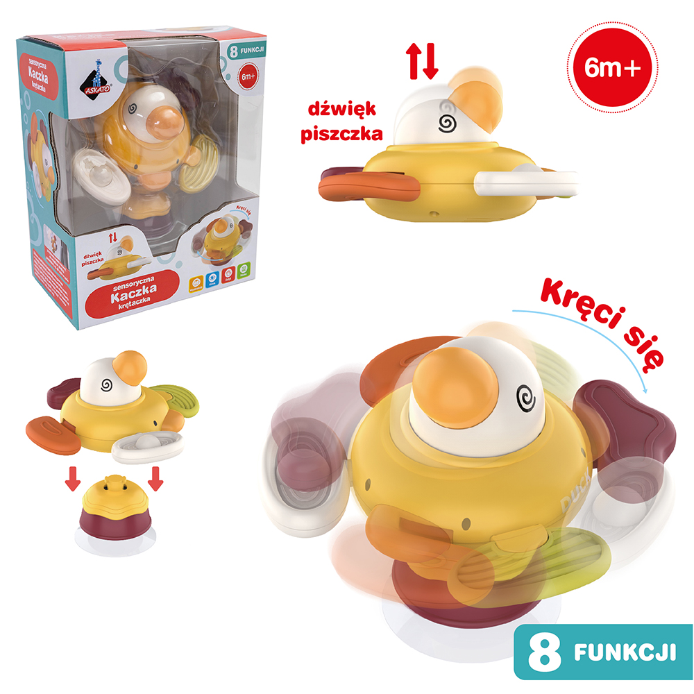 8 funkcyjna zabawka. Może być za pomocą przyssawki przyklejona do szyby, stolika, lustra i wówczas kręci się wokół swojej osi. Przy potrząsaniu grzechocze, naciskając głowę kaczuszki usłyszymy dźwięki. 4 ruchome sensoryczne wypustki o różnych fakturach, kolorach i kształtach. Jedna przesuwa się w pionie i poziomie wydając dźwięki, druga obraca się o 360 stopni i można silikonowy guziczek przepychać paluszkiem w górę i w dół, trzecia i czwarta oprócz tego, że są silikonowymi gryzakami można je wysuwać i wsuwać.