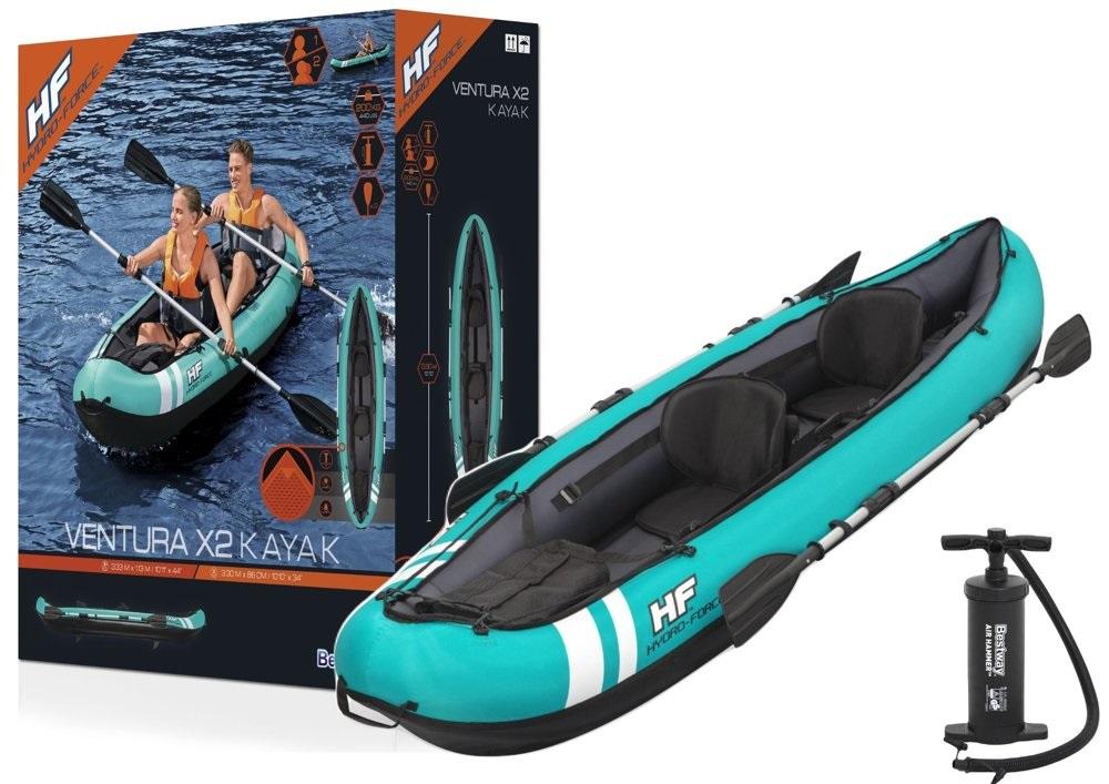 Kajak Dmuchany Dwuosobowy 330 x 86 cm Bestway 65052 Wyjazd nad wodę to idealna forma spędzania wolnego czasu. Aby urozmaicić sobie ten beztroski czas zaopatrz się w dodatkowe akcesoria basenowe. Kajak idealnie sprawdzi się również podczas rekreacyjnej wycieczki po jeziorze lub basenie. Został wykonany z wytrzymałego winylu odpornego na uszkodzenia. Tkanina jest olejoodporna, wodoodporna i wytrzymuje intensywne promienie UV. Wysokiej jakości nylonowa powłoka jest również odporna na przebicie i zbudowana tak, aby wytrzymać szorstkie i często kamieniste wody rzeki. Będziesz mógł manewrować po krętych rzekach, jeziorach, spokojnych wodach otwartych lub odpływach i przypływach fal. Zaprojektowany z regulowanymi oparciami zapewniającymi wygodę i podparcie, Oprócz schowka umieszczonego w konstrukcji statku, jest również wyjmowana torba do przechowywania, która umożliwia aby mieć dostęp do niezbędnych rzeczy podczas wiosłowania po wodzie. Wiosła z podwójnym piórem są aluminiowe, lekkie i trzymane równo za pomocą bezpiecznych zatrzasków. Po całkowitym napompowaniu za pomocą ręcznej pompki kajak ma 2.80 m długości i może unieść do 200 kg . Posiada solidne płócienne uchwyty z każdej strony, dzięki czemu przenoszenie kajaka jest dziecinnie proste. Kajak ma zdejmowane płetwy, które pomagają zachować stabilność kierunkową i zwiększają prędkość. W celu przechowywania wystarczy odłączyć płetwy od kajaka, aby uzyskać ultra kompaktowy, oszczędzający miejsce element. Zawartość zestawu: - dmuchany kajak dwuosobowy - wiosła - pompka ręczna - torba transportowa - łatka naprawcza Dane techniczne: - Wymiary materaca 330 x 86 cm - Maksymalne obciążenie 130 kg - wiosło 218 cm - maksymalne obciążenie 200 kg - linka bezpieczeństwa - solidna konstrukcja - linka bezpieczeństwa umieszczona na całej długości Waga: 17 kg Wymiary opakowania: 75 cm x 65 cm x 26 cm