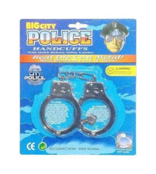Kajdanki metalowe wraz z kluczykami do pojmania niejednego przestępcy. Urozmaicą zabawę w policjanta bądź będą akcesorium do stroju na balik karnawałowy. Zabawka dla dzieci od 3 lat. Podane wymiary są wymiarami opakowania. Zabawka zapakowana w kartonowa podstawkę z przezroczystym kloszem.