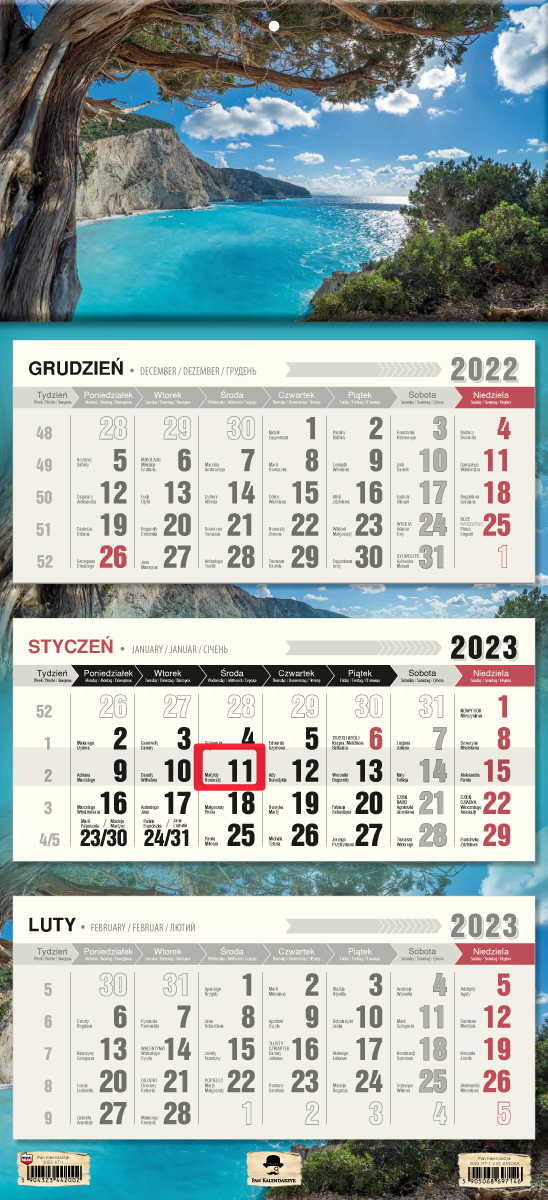 Kalendarz trójdzielny z płaską główką, format 315/680mm, główka z otworem wierconym, klasyczny układ trzech kalendariów z przesuwanym okienkiem, kalendarium wyraźne i czytelne z dużymi cyframi, posiada miejsce do notowania, dodatkowo nazwy miesięcy i dni tygodnia w języku Angielskim, Niemieckim i Ukraińskim.