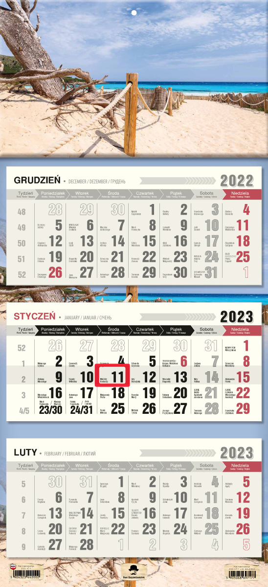 Kalendarz trójdzielny z płaską główką, format 315/680mm, główka z otworem wierconym, klasyczny układ trzech kalendariów z przesuwanym okienkiem, kalendarium wyraźne i czytelne z dużymi cyframi, posiada miejsce do notowania, dodatkowo nazwy miesięcy i dni tygodnia w języku Angielskim, Niemieckim i Ukraińskim.