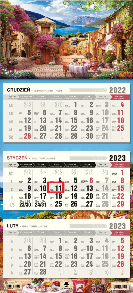 Kalendarz trójdzielny z płaską główką, format 315/680mm, główka z otworem wierconym, klasyczny układ trzech kalendariów z przesuwanym okienkiem, kalendarium wyraźne i czytelne z dużymi cyframi, posiada miejsce do notowania, dodatkowo nazwy miesięcy i dni tygodnia w języku Angielskim, Niemieckim i Ukraińskim.