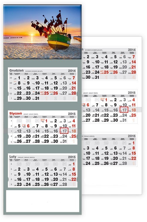 Wymiar kalendarza: 32 X 85,5cm Wymiar zdjęcia: 32 x 22 cm Kolor pleców: szary Kalendarium:: wym. 28,5 x 14 cm, czterojęzyczne (PL, GB, D, RUS), z numeracją tygodni i imieninami jest przytrzymywane przez kartonowe wypustki, które zapobiegają jego odstawaniu od plecków kalendarza. W kalendarium dodatkowo zaznaczone są święta 10. państw Unii Europejskiej: Anglii, Austrii, Niemiec, Francji, Hiszpanii, Włoch, Szwecji, Danii, Czech, Słowacji. Wykończenie: pasek z czerwonym przesuwanym okienkiem W cenie kalendarza jest biała koperta z kartonu z ozdobnym wycięciem