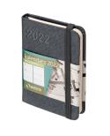 Format A7 oprawa: twarda materiał: ekskluzywna skóra ekologiczna papier: 80g kolor papieru: ecru pionowa gumka zamykająca zaokrąglone rogi wyklejka z ozdobnego czarnego papieru koperta na luźne karteczki wstążka w kolorze okładki dodatkowe strony: skrócony kalendarz 2021-2023 plan roku 2022 ważne wydarzenianotatnik oraz skorowidz adresowy 144 strony 110x78 mm