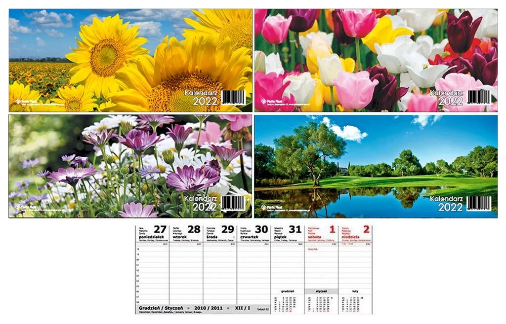 Kalendarz biurkowy poziomy, dostępny w 4 różnych wzorach, kalendarium tygodniowe, zaznaczone święta oraz niedziele, format 29,5x12 cm