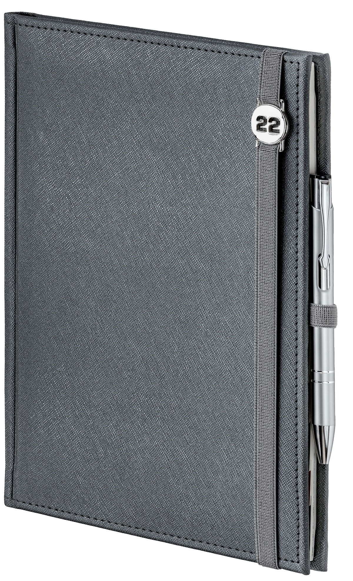 Kalendarz A4 tygodniowy z notesem, papier kremowy 70g/m2 z registrami. format bloku 200x294mm, 156 stron, druk szaro-bordowy, rozbudowana część informacyjna, skorowidz teleadresowy, kalendarium PL, GB, D, F, RUS, kapitałka i tasiemka żółte. Kalendarz Cross z gumką w kolorze okładki, na gumce ażurowa data chromowana. Długopis za dodatkową opłatą.