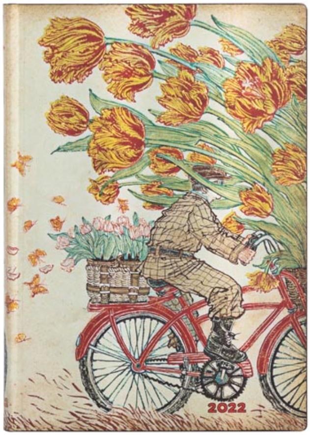 Kalendarz na rok 2022, 12-miesięczny MIDI FLEXI z kolekcji ekskluzywnej marki Paperblanks. Ilustracja na okładce autorstwa japońskiego twórcy Yuko Shimizu, która została pierwotnie stworzona dla artykułu w magazynie z 2012 r. na temat holenderskiego systemu emerytalnego, przedstawia artystyczną koncepcję dotyczącą „dawania przykładu”.