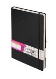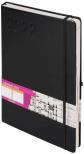 Format A4 oprawa: twarda materiał: ekskluzywna skóra ekologiczna papier: 80g kolor papieru: ecru pionowa gumka zamykająca gumka na długopis zaokrąglone rogi wyklejka z ozdobnego czarnego papieru koperta na luźne karteczki wstążka w kolorze okładki dodatkowe strony: skrócony kalendarz 2021-2023 plan roku 2022 ważne wydarzenia notatnik oraz skorowidz adresowy 200 stron 297x210 mm
