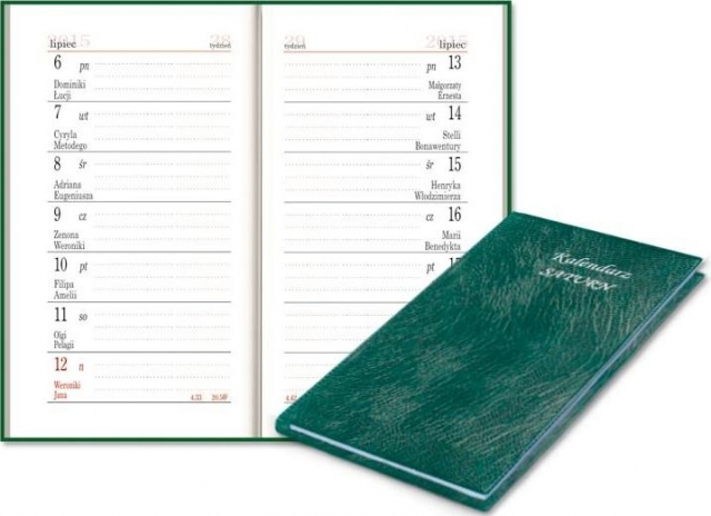 Układ 1 tydzień na stronie Druk, Papier 2 kolory, papier 70g/m2 w kolorze białym Kalendarium w języku polskim, numeracja tygodni, wschody i zachody Słońca, fazy Księżyca, podwójne imieniny Oprawa ze szlachetnych folii PCV o różnorodnym wzornictwie Część informacyjna plan roczny, miesięczny, telefony kierunkowe, skorowidz alfabetyczny, mapka z odległościami drogowymi w Polsce, kalendarz stuletni