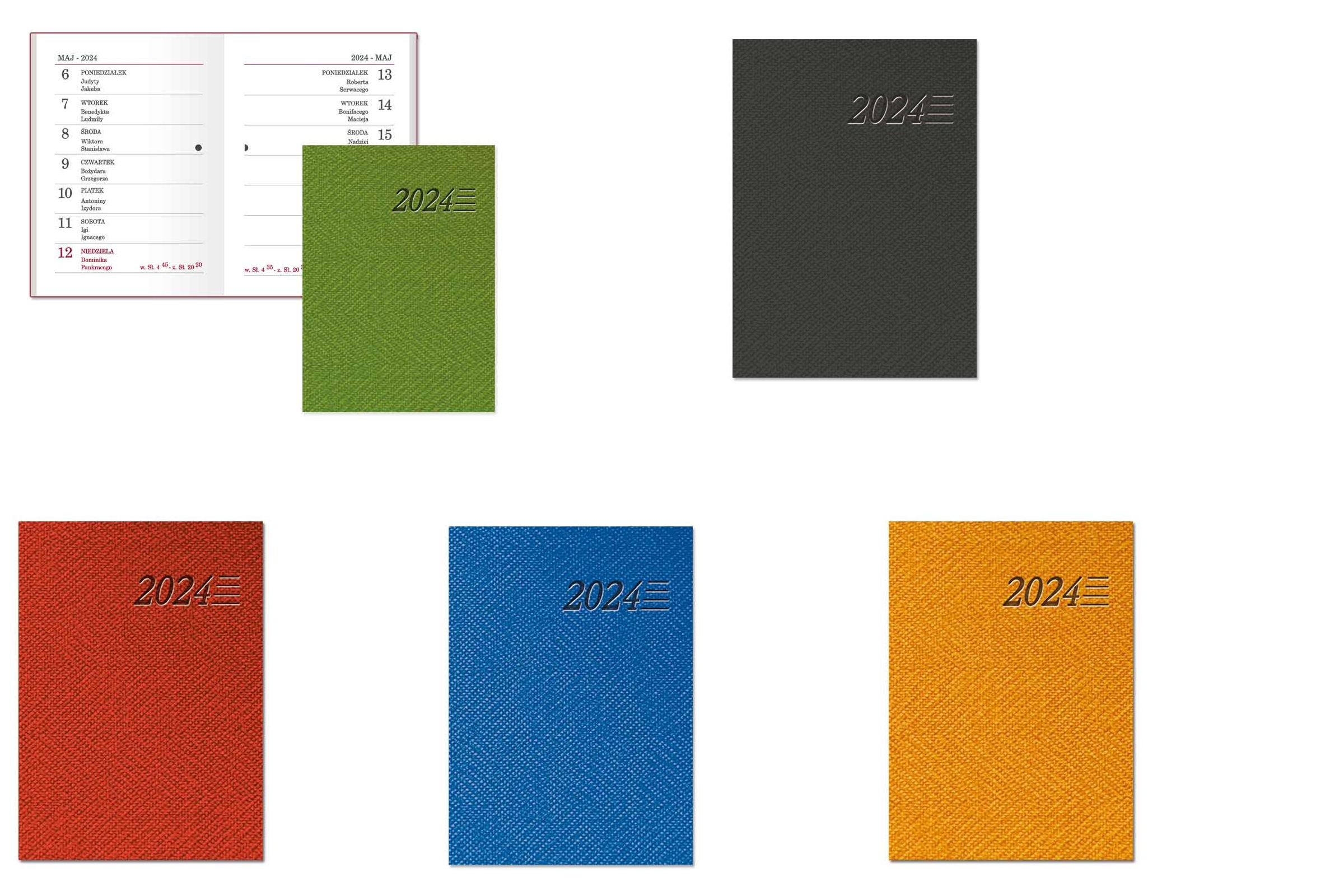Układ 1 tydzień na stronie Druk, Papier 2 kolory, papier 70g/m2 w kolorze białym Kalendarium w języku polskim, wschody i zachody Słońca, fazy Księżyca, podwójne imieniny Oprawa z folii PCV Część informacyjna skrócone kalendarium roku 2011 oraz 2012, skorowidz alfabetyczny, telefony kierunkowe, spis imienin, święta w latach 2012 - 2014, kalendarz stuletni