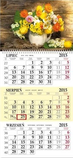 Kalendarium w układzie 3 miesiące na stronie, bieżący miesiąc wyróżniony kolorystycznie główka płaska - karton z okienkiem.