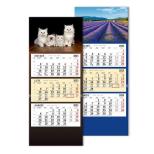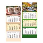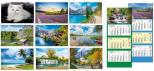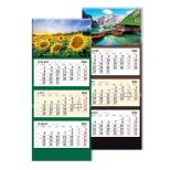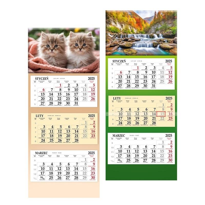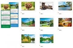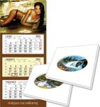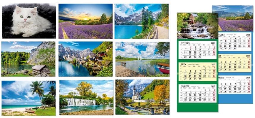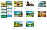 3 oddzielne kalendaria, miesiąc poprzedni, bieżący wyróżniony kolorystycznie i następny Druk, Papier główka - karton 250 g/m2 kaszerowana - efekt wypukłości zdjęcia + folia 8 zdjęć tematycznych, możliwość wykonania indywidualnej główki kalendarium - offset 70 g/m2, 2 kolory plecki - karton 400 g/m2, niebieski, zielony, brązowy